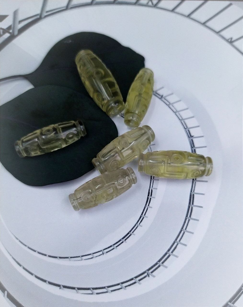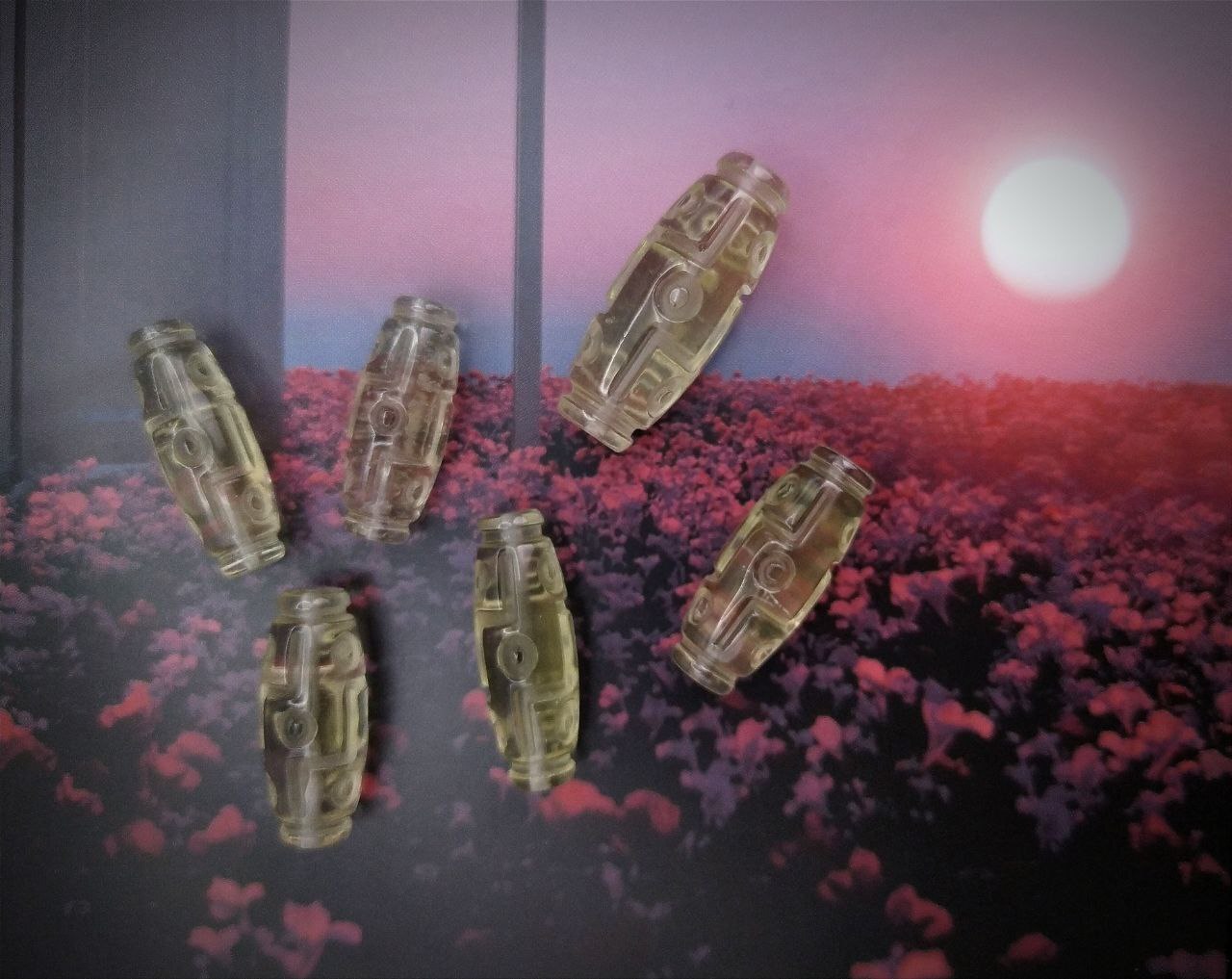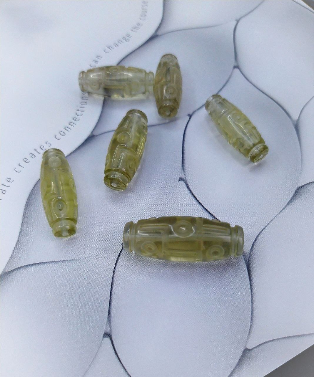 Бусина выполнена из ливийского стекла. Тектит. В основном желтого, иногда белого цвета, с некоторым содержанием черного вещества в котором можно обнаружить следы метеоритного вещества. Поле рассеивания ливийского стекла находится на территории Ливийской пустыни, которая географически располагается в трех странах: Египет, Ливия, Судан.